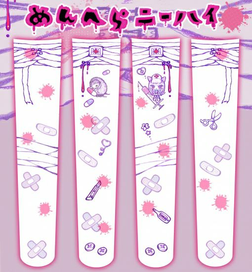「おくすり・ほうたい・おちゅーしゃ・かったー・ばんそうこう」包帯の白を基調としてメンヘラ感のあるアイテムをちりばめました。どなたでもかわいく履きこなせるデザインになっています。