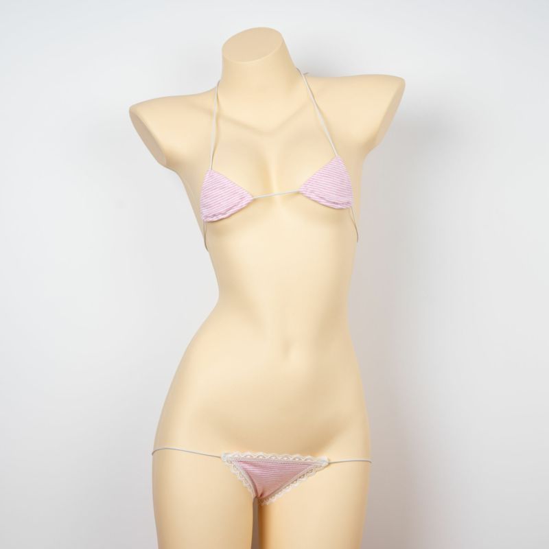しましま グラビアのマイクロ三角ブラ 極細紐 &しましま グラビアの超ローライズTバックパンツ 極細紐〈極細ボーダーピンク縞×白レース〉