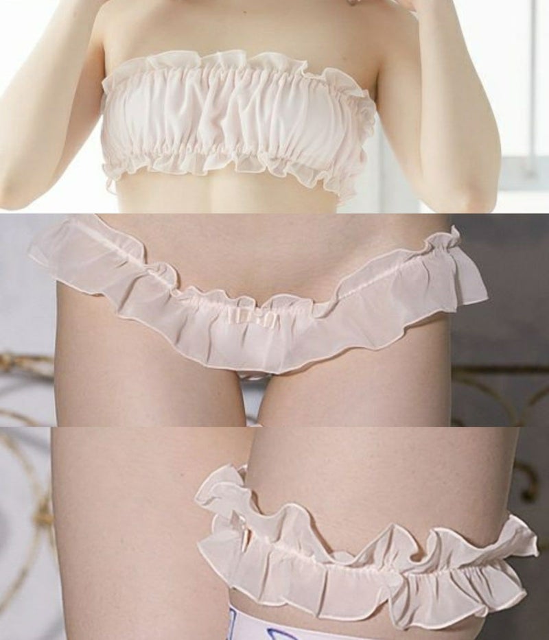 シフォンチューブトップブラ〈ピンク〉& 超ローライズ シフォンリボンパンツ 〈ピンク〉& シフォンリボンキャットガーター〈ピンク〉セット