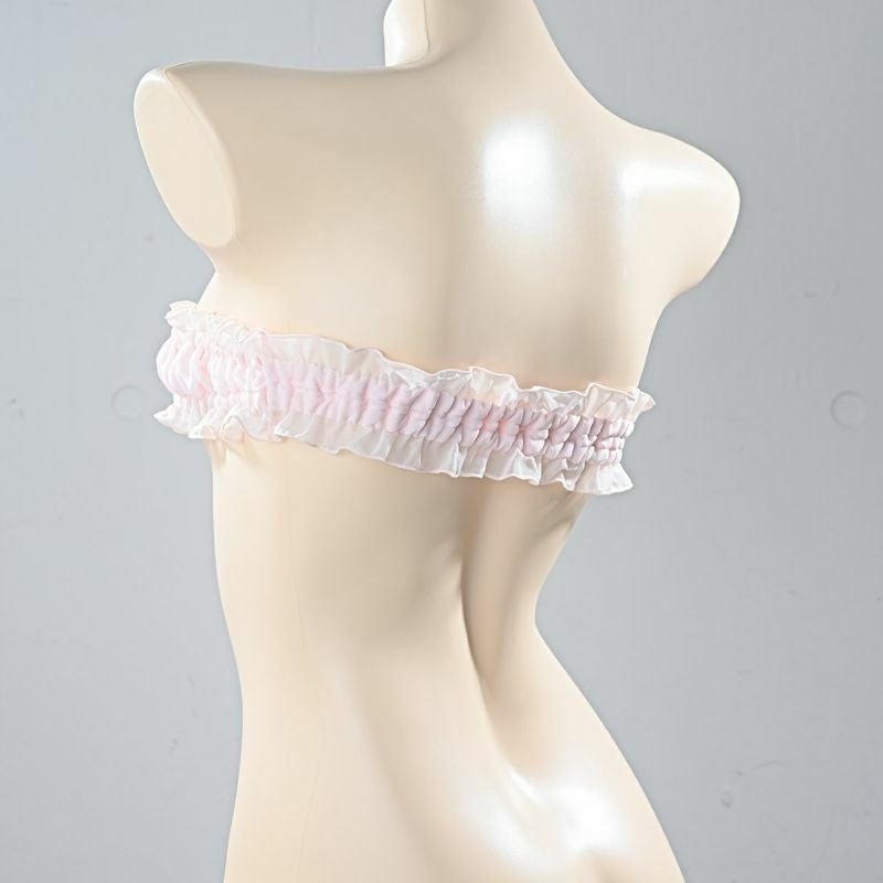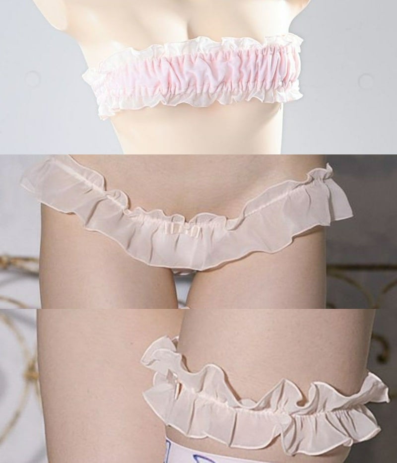 ナローシフォン チューブトップブラ〈ピンク〉& 超ローライズ シフォンリボンパンツ 〈ピンク〉& シフォンリボンキャットガーター〈ピンク〉セット