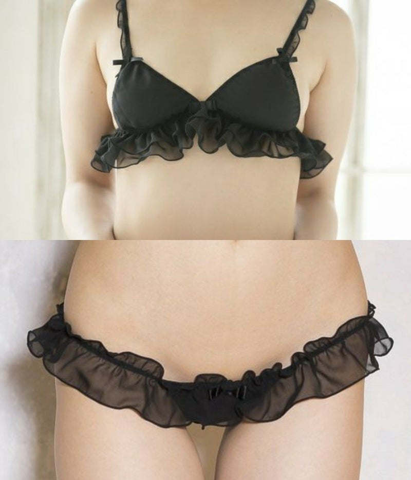 シフォンバックリボンノンワイヤーブラ〈黒〉& 超ローライズ シフォンリボンパンツ〈黒〉セット