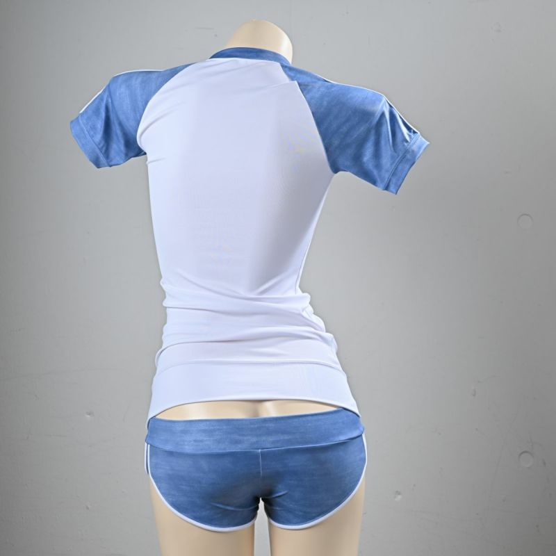 グラビアのストレッチ体操服上着ストレッチデニム素材〈デニム袖×白ライン〉× 超ローライズラインホットパンツ ストレッチデニム素材〈デニム×白ライン〉 セット