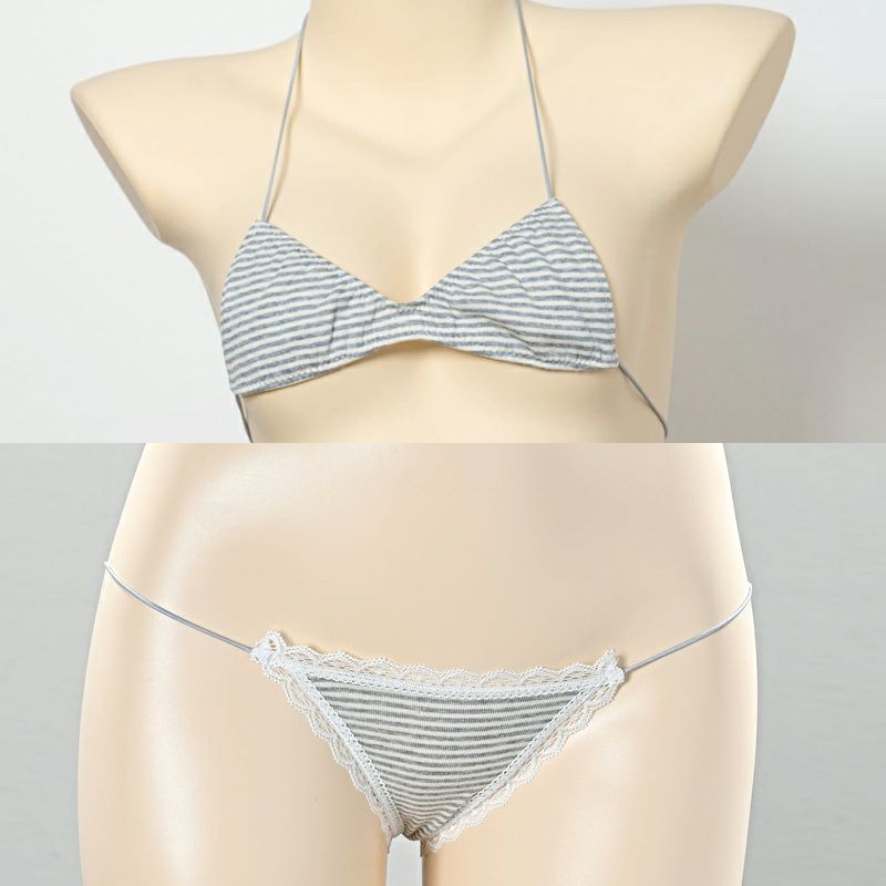 しましまグラビアのコットンマイクロスポーツブラ〈グレー縞〉 & しましま グラビアのコットン超ローライズTバックパンツ〈グレー縞×白レース〉