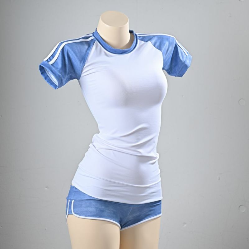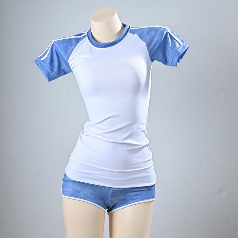 グラビアのストレッチ体操服上着ストレッチデニム素材〈デニム袖×白ライン〉× 超ローライズラインホットパンツ ストレッチデニム素材〈デニム×白ライン〉 セット