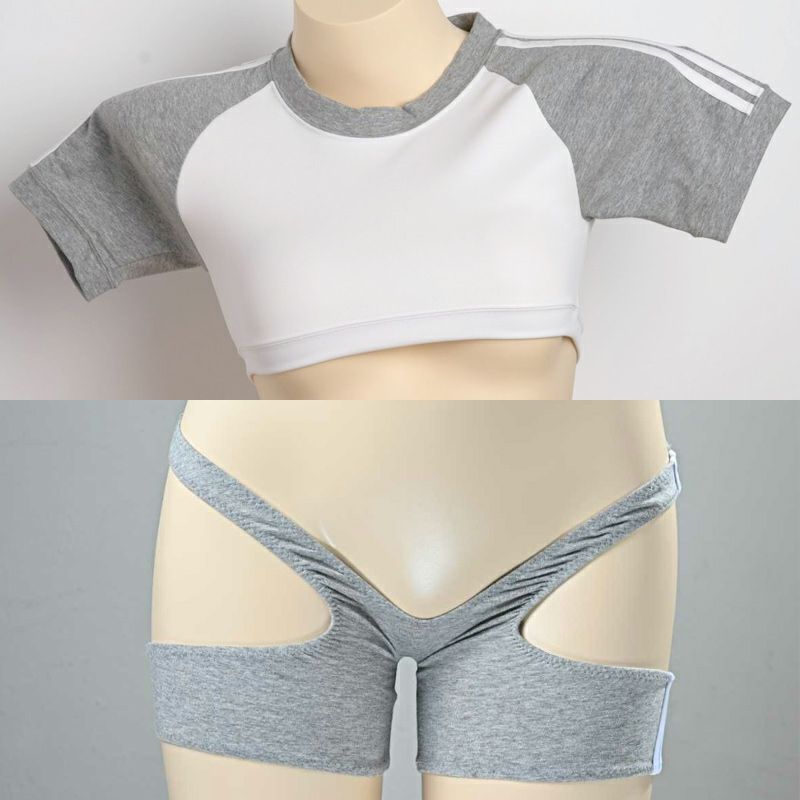 グラビアのストレッチ体操服半乳上着グレー〈グレー袖×白ライン〉 & グラビアの紙魚丸×PredatorRat「Tバックスパッツ」コットン素材 ライン入り〈グレー×白ライン〉