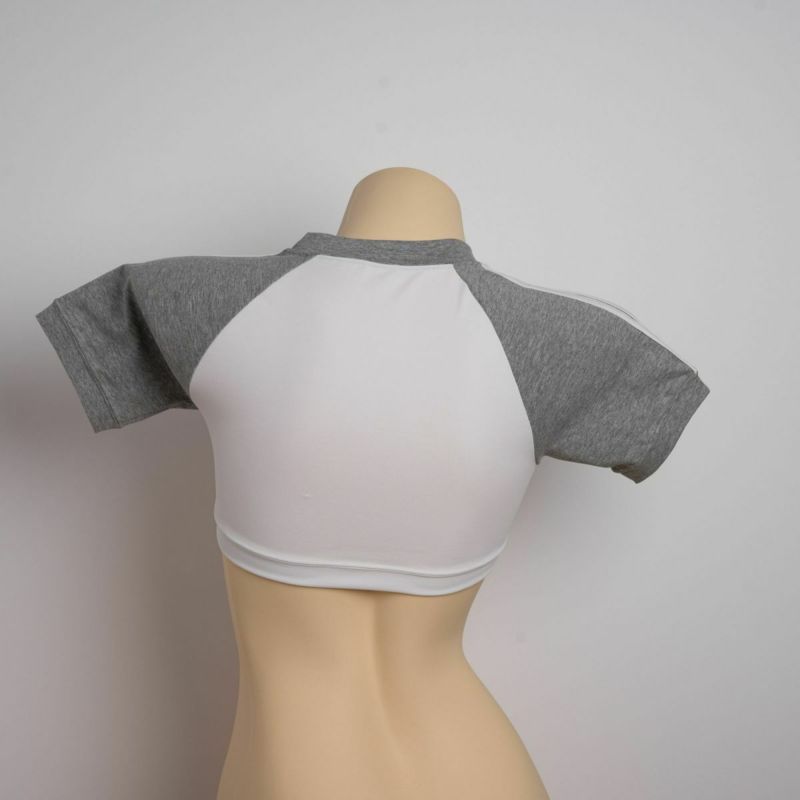 超ローライズラインブルマと同シリーズの体操着上着(グレー袖×白ライン入り)の半乳バージョンです。