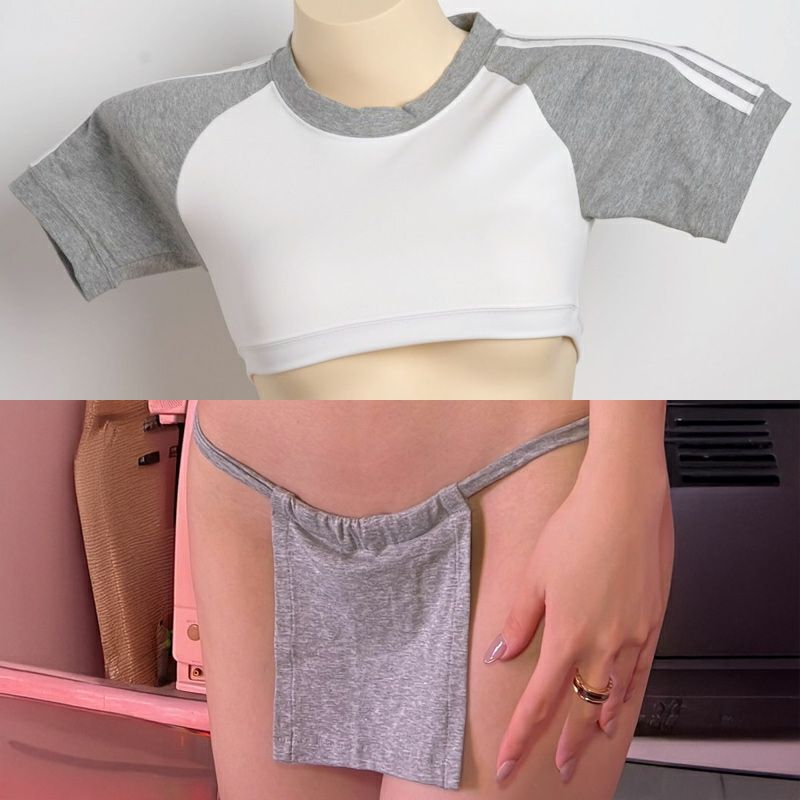 超ローライズラインブルマと同シリーズの体操着上着(グレー袖×白ライン入り)の半乳バージョンです。