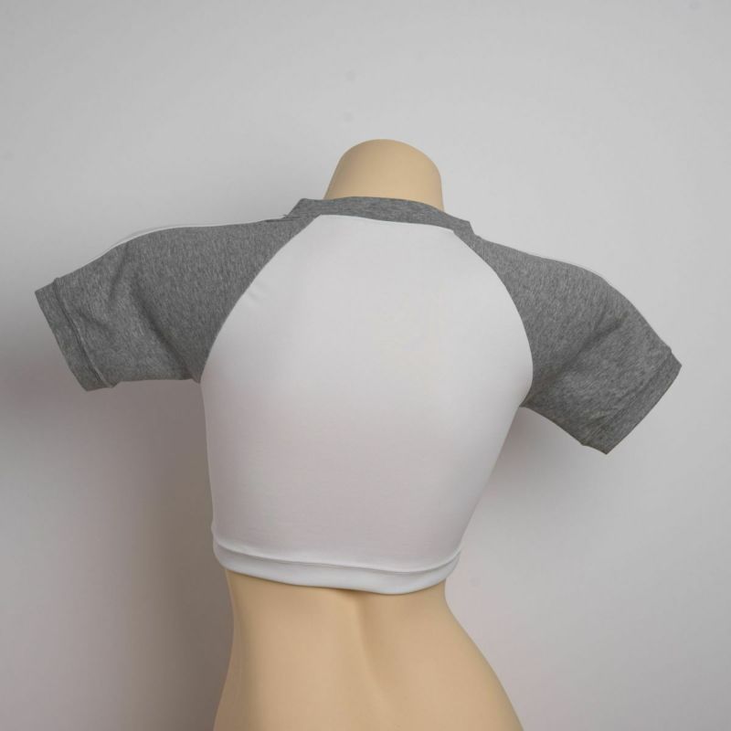 体操着上着(グレー×白ライン)のハーフ丈バージョンです。超ストレッチ&ピタピタのコットングレー素材のかわいい体操着の上着です。お腹周りをカッコ良く見せる丈に調整しました。