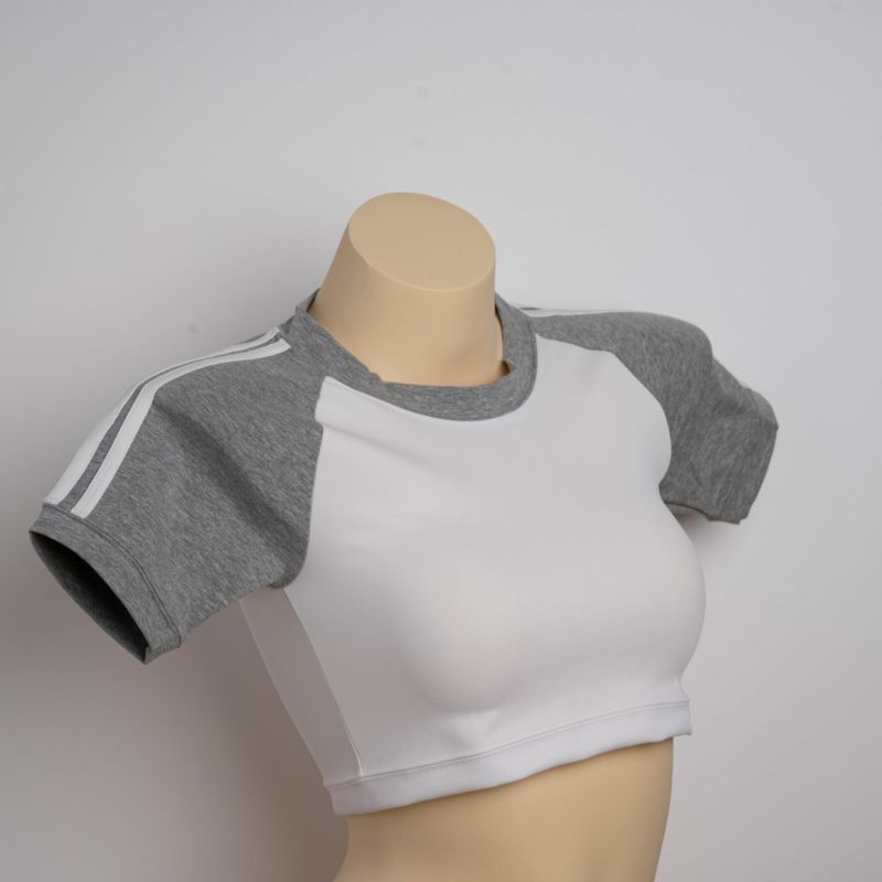 体操着上着(グレー×白ライン)のハーフ丈バージョンです。超ストレッチ&ピタピタのコットングレー素材のかわいい体操着の上着です。お腹周りをカッコ良く見せる丈に調整しました。