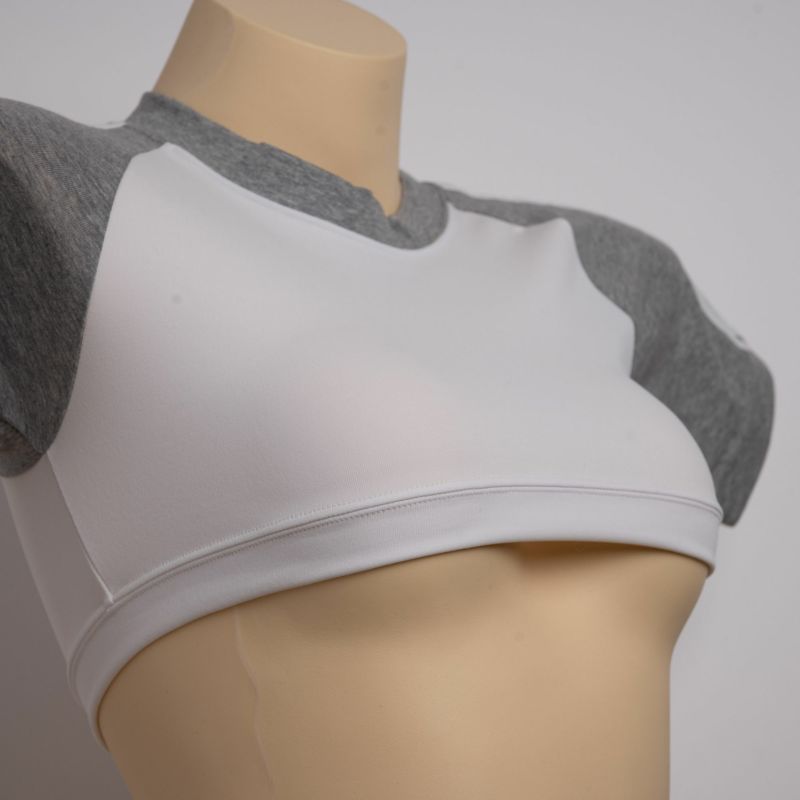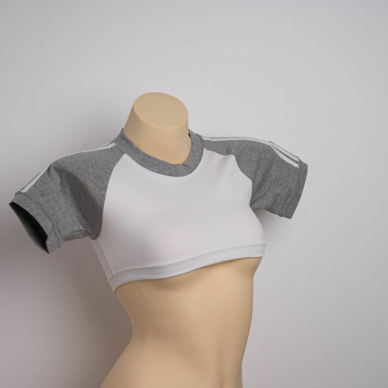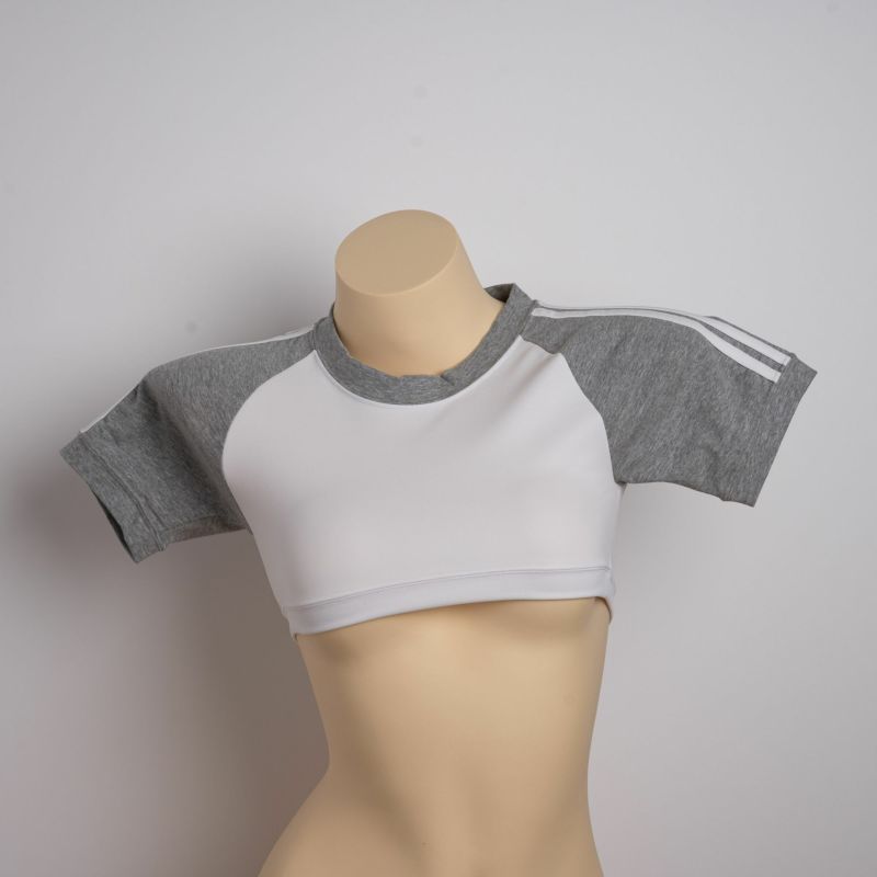 超ローライズラインブルマと同シリーズの体操着上着(グレー袖×白ライン入り)の半乳バージョンです。